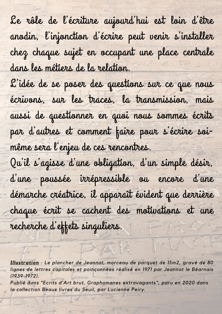 Aujourd’hui, une réflexion autour de l’écriture a débuté et ouverte à ceux qui souhaitent y participer.